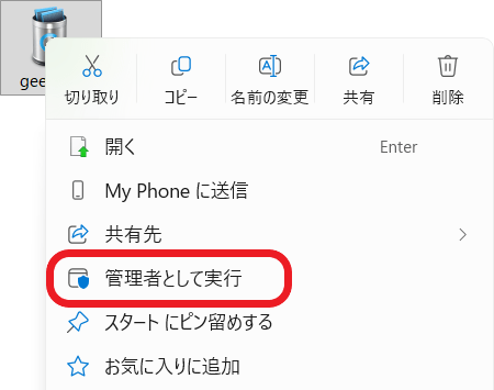マウスカーソルで「geek.exe」を右クリック→「管理者として実行」を選びます。