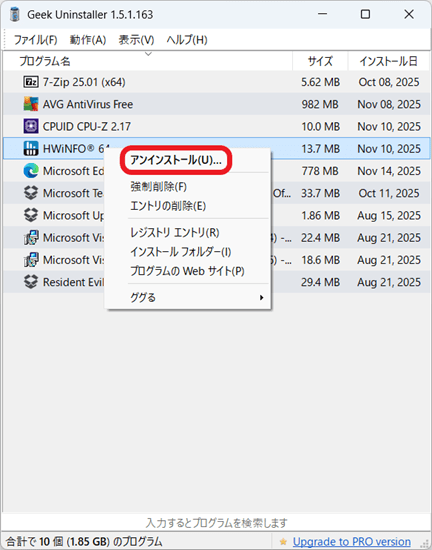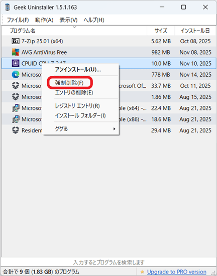 「Geek Uninstaller」を起動させます。該当プログラムを右クリックして「強制削除」を選択します。