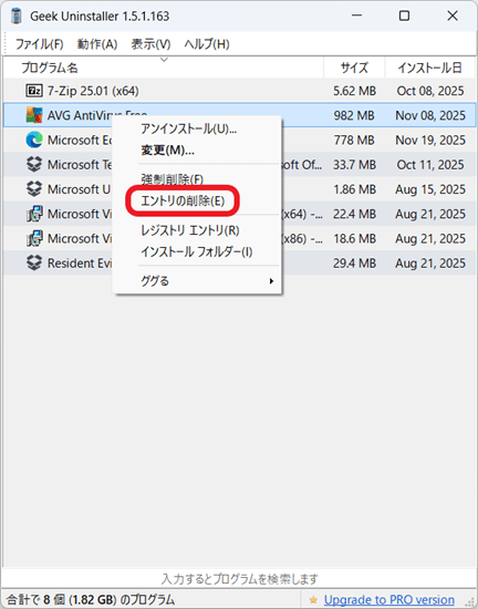 「Geek Uninstaller」を起動させます。該当プログラムを右クリックして「エントリの削除」をクリックします。