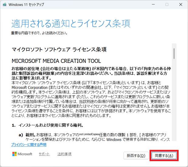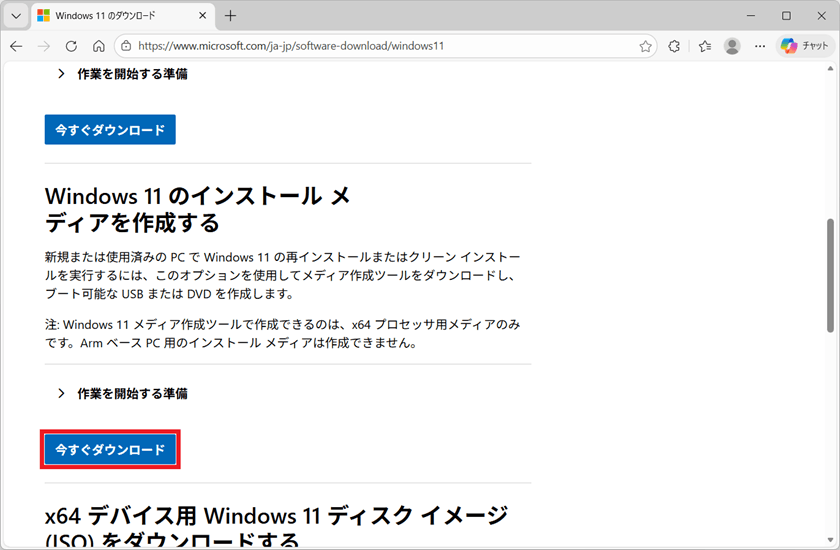 下記リンクURLから、「MediaCreationTool」をダウンロードします。