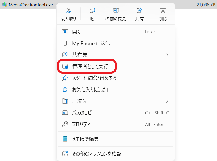 ダウンロードした「MediaCreationTool」を右クリックして、「管理者として実行」を選択します。