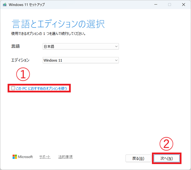 「このPCにおすすめのオプションを使う」の✓マークを外して、言語とエディションを選択。「次へ」をクリックします。