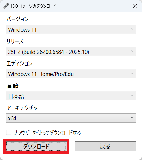 バージョンやエディションなど詳細を選択して、「ダウンロード」ボタンをクリック。ISOファイルが入手できます。