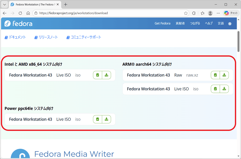 「Fedora公式ページ」にてISOファイルは入手できます。