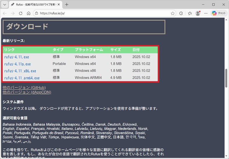 Rufusの公式サイト」から、ソフトウェアのダウンロードができます。