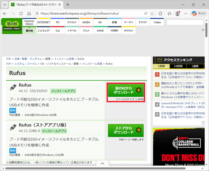 こちらの「窓の杜」から「Rufus」がダウンロードできます。