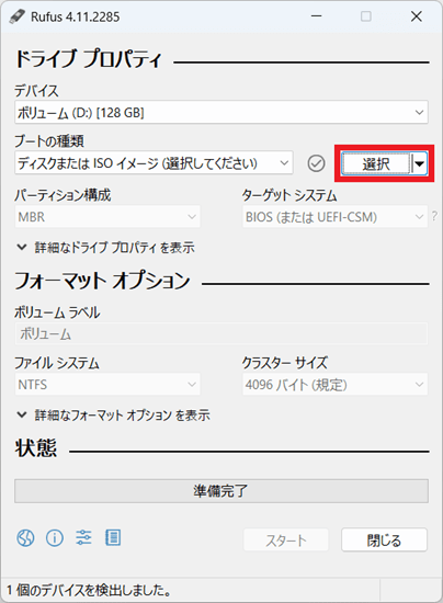 「Rufus」アプリの画面が表示されますので、「選択」ボタンをクリックします。
