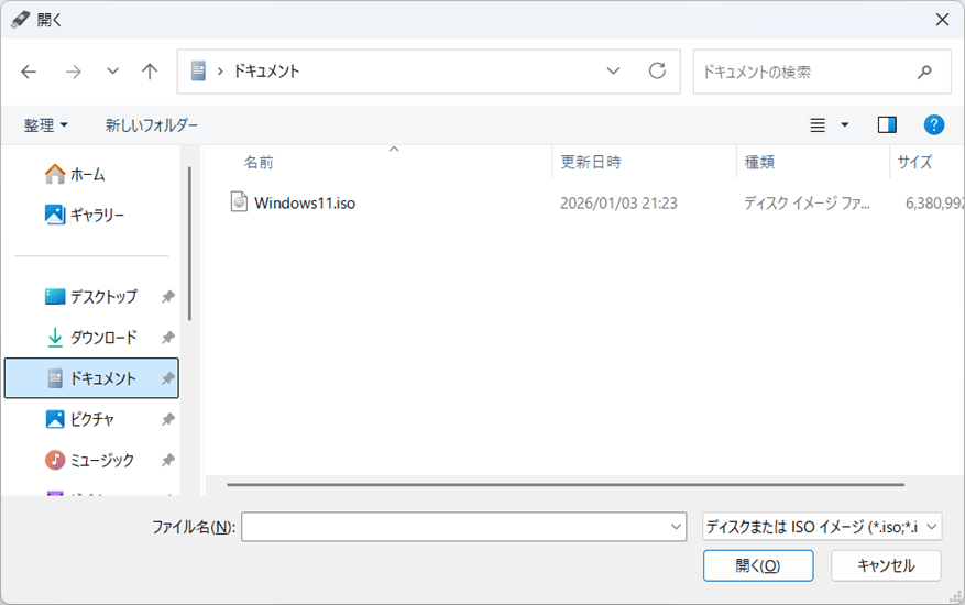 Windows11や10などのOSデータが入っているisoファイルを選びます。(※保管場所を指定してください。)